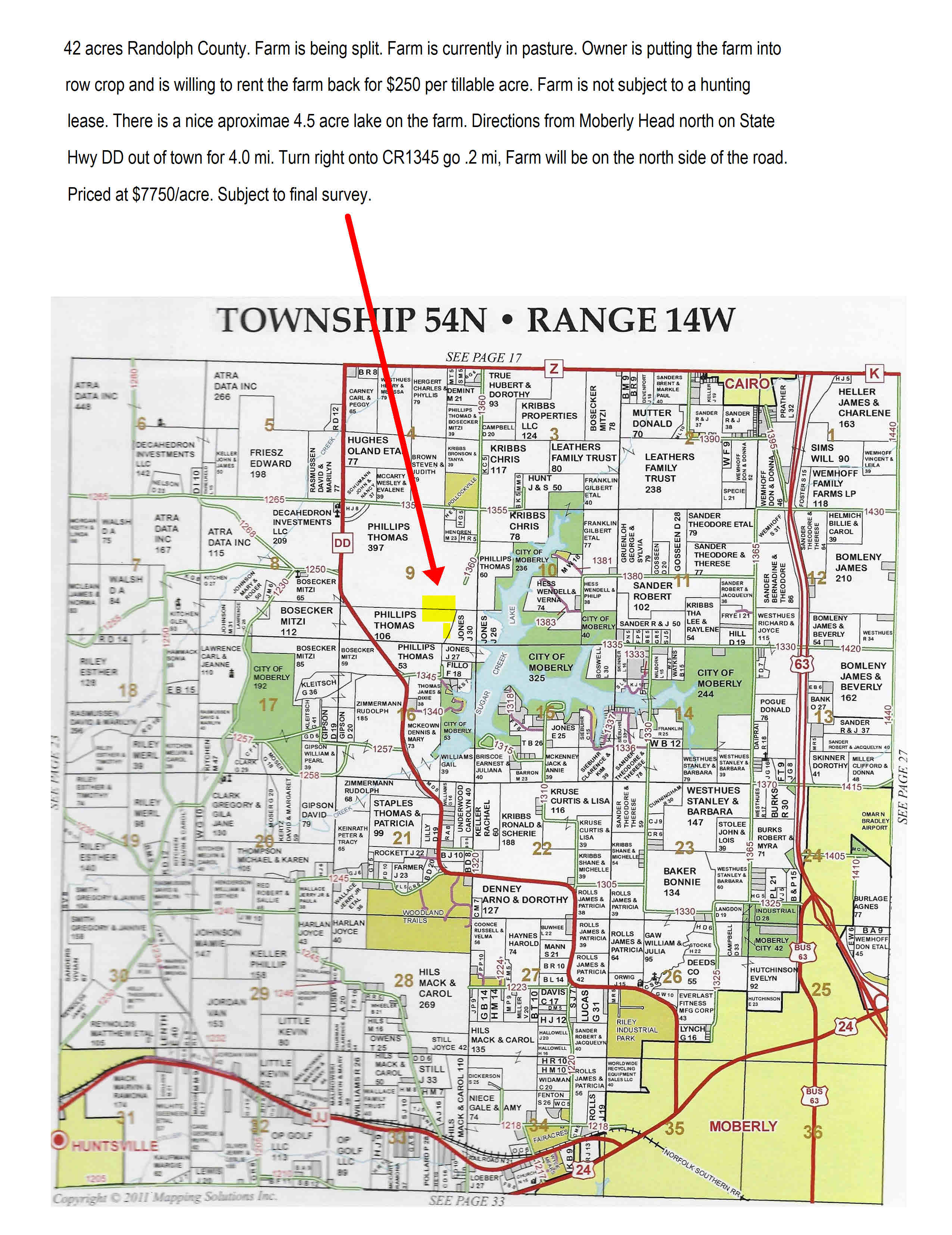 42 acres Randolph County being split from larger tract Farm is currently in pasture, owner putting farm in row crop & is willing to rent it back at $250 per tillable acre. Farm is NOT subject to a hunting lease. There is a nice Lake on the farm approximately 4.5 ac. Priced at $7750 per acre.